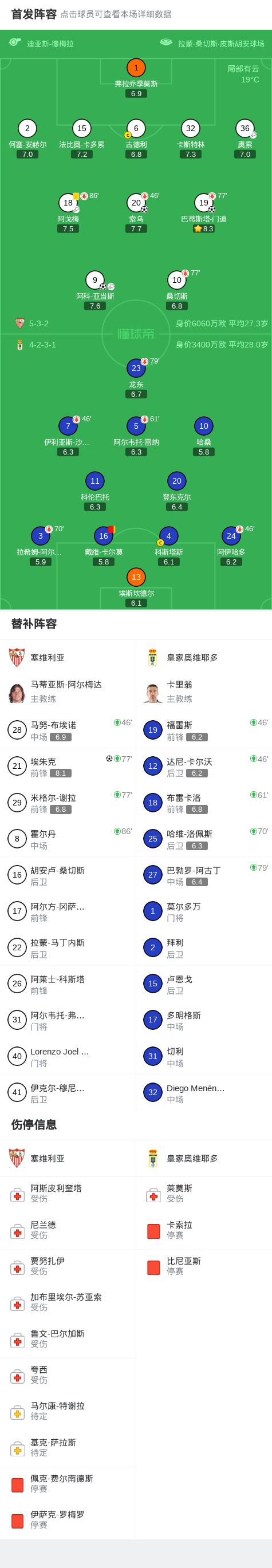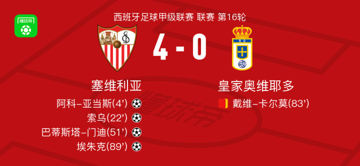 塞維利亞4-0大勝皇家?jiàn)W維耶多,埃朱克、巴蒂斯塔-門迪破門
